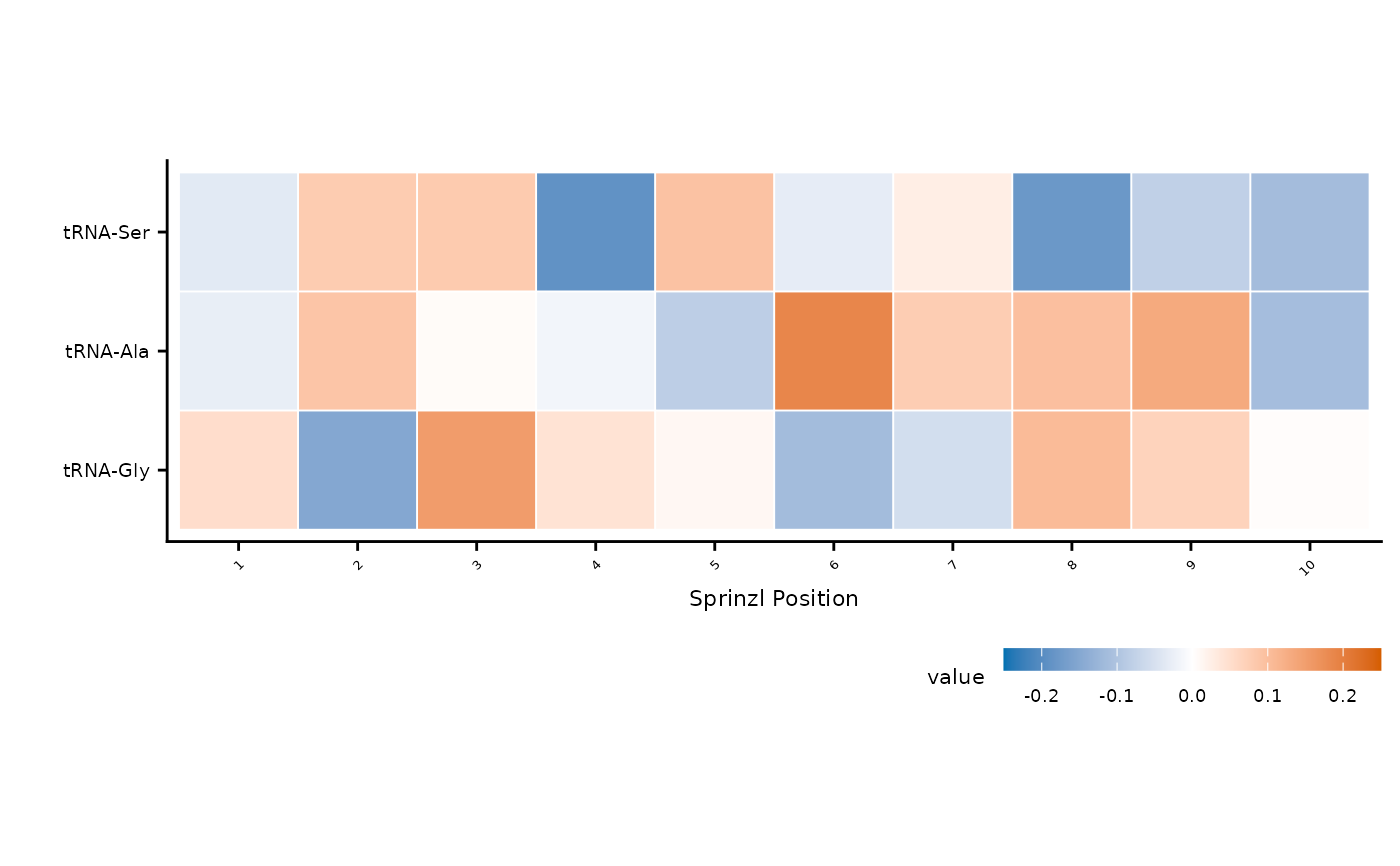 A data frame with at least three columns: one for tRNA family/reference (y-axis), one for Sprinzl position labels (x-axis), and one for the fill value.